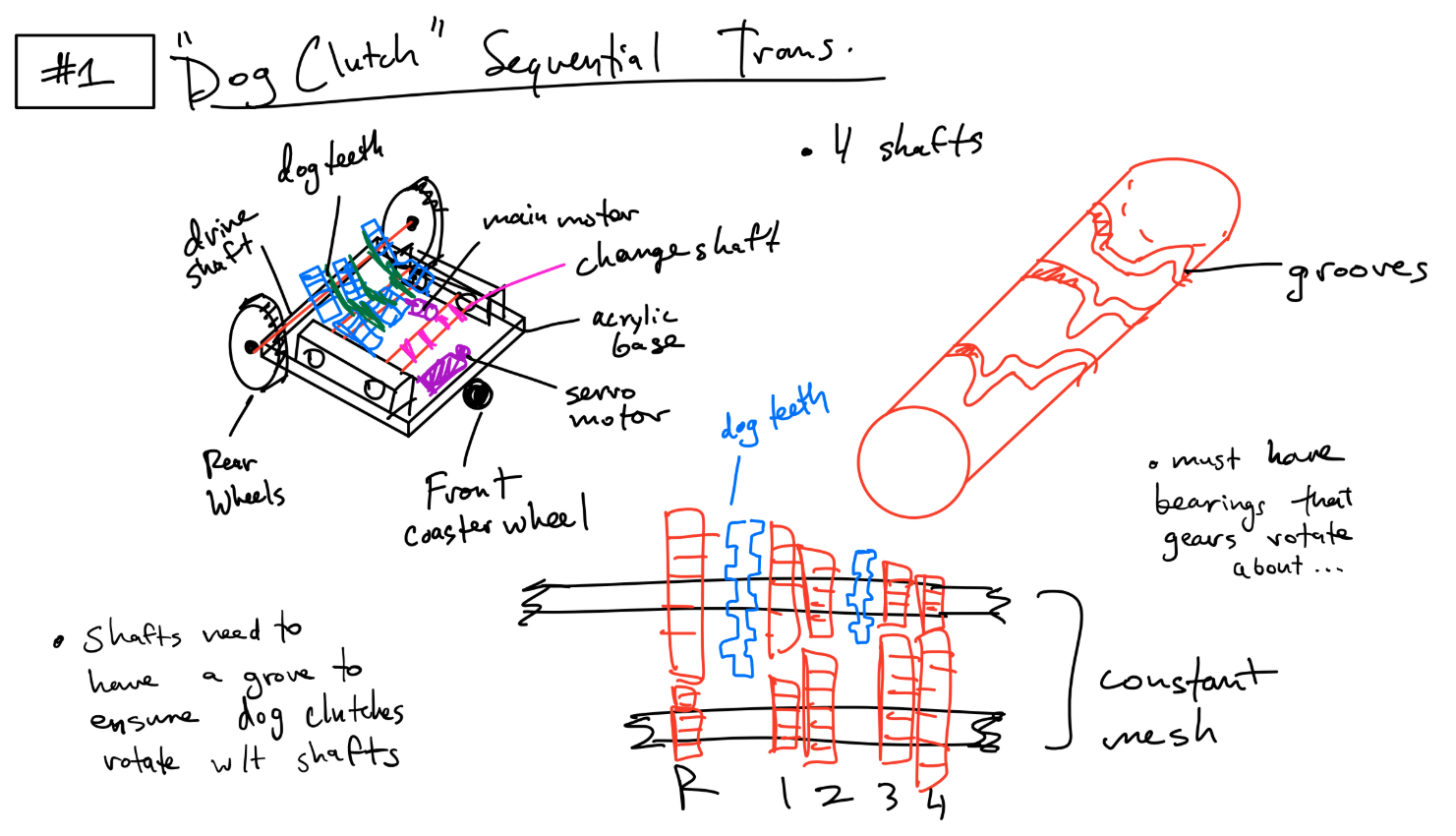 Sketches of transmission designs were used to illustrate mechanical concepts. The above shows a sequential dog clutch design that can incorporate several forward gears and a reverse gear.