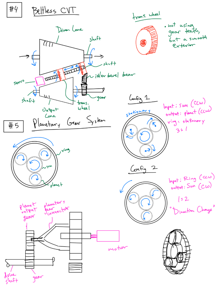 Sketches of transmission designs were used to illustrate mechanical concepts. The above shows a planetary gear set design as well as a beltless CVT design.